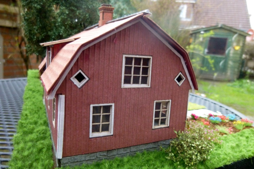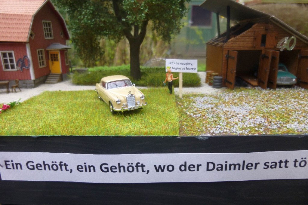 Wenn man 40 wird, sollte man zumindest in 1:87 seine Träume erfüllt bekommen, also musste ein Gehöft her (Joswood Kattult-Hof, super Lasercut-Bausatz, aber braucht viel Zeit zum Zusammenbau) und zwar mit Schrauberscheune (Busch Holz & Lasercut, tolles Teil). Und dann gibt’s natürlich einige Szenen aus der Vergangenheit und zu Vorlieben in der Gegenwart (Gruselfilme, True Crime, marodierende Eichhörnchen, Daimlerfahrzeuge). Erstaunlich, wo sich überall nachtaktive Mitbewohner*Innen finden….