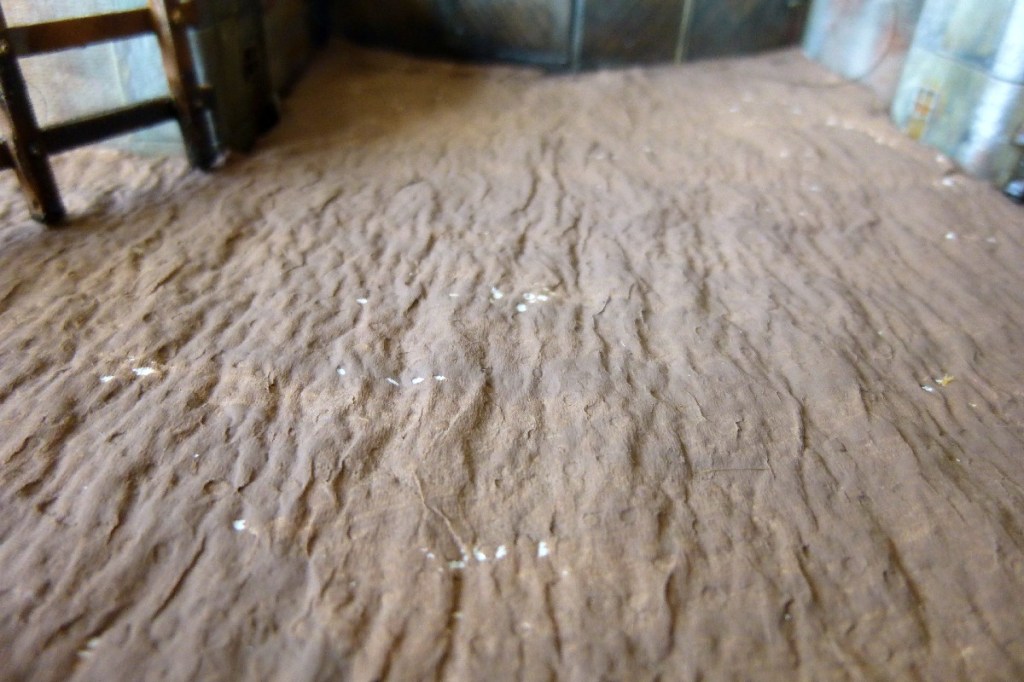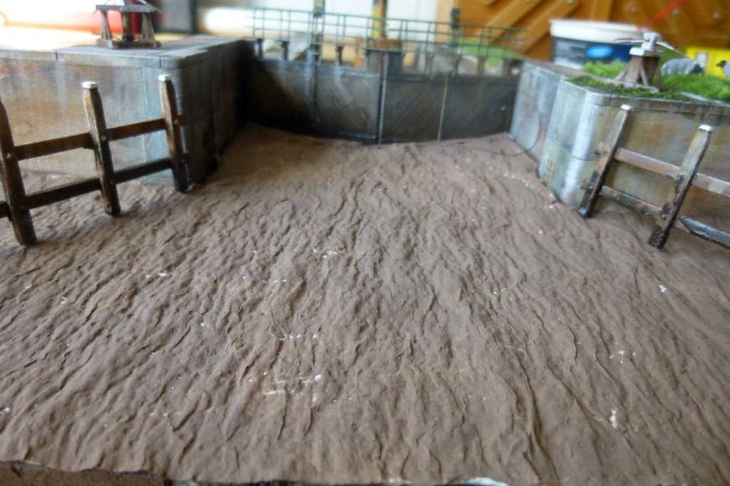 In der Schleuse werde ich (wie im Kanal auch) Küchenpapier ganz fest auf die Styrodurbasis leimen, trocknen lassen und dann Farbe aufbringen: braun mit etwas grün aufgetupft, Renates Tipps gedankt.